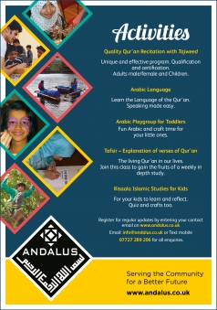 Arabic language courses, Quranic recitation and Tajweed classes during daytime and evenings starting soon. Please contact us for further information. Lots more happening at Andalus, don't miss out, never too late to learn.