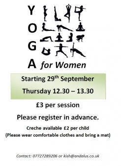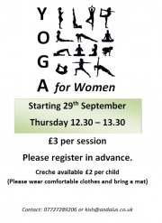 Starting 29th September we are going to be running Yoga classes for women at Andalus, every Thursday 12.30pm - 13.30pm.